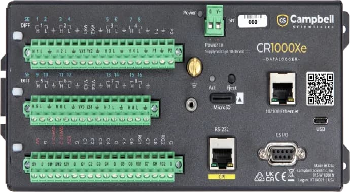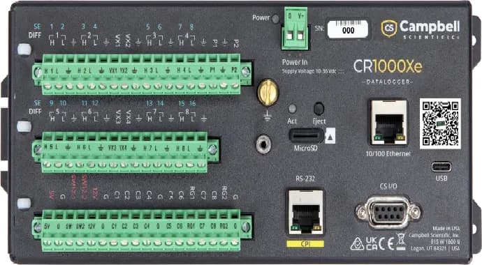 查看更多 >CR1000X 是美国 Campbell Scientific 公司生产的一款多功能、高性能 数据记录仪(Data Logger),专为环境监测、气象、农业、水文、能源等领域的长期野外测量任务而设计。🔍 一、什么是 CR1000X 数据记录仪? CR1000X具备更强的处理能力、更高的采样速率、更丰富的接口,适合用于复杂测量系统中,是一个 可编程的数据采集、存储与控制平台。📊 二、CR1000X 可以测量什么?CR1000X 本身不直接“测量”环境变量,它的功能是 接收、处理、存储连接的各种传感器信号,通过编程控制整个测量系统。它可连接多种传感器,常见的测量类型包括:测量参数类别 示例传感器 可测参数气象: 风速风向传感器、温湿度传感器、辐射传感器、气压计、雨量计等 风速、风向、温度、相对湿度、太阳辐射、降水量、气压等水文: 水位计、水流量计、土壤水分传感器 河流水位、水流速、土壤水分、蒸发等农业 :叶面湿度、土壤温度、光照强度、CO₂ 传感器 光合有效辐射、CO₂ 浓度、土壤剖面温湿度能源与工业: 电压/电流传感器、负载监测、太阳能板辐照度 电压、电流、能&量输出、太阳能辐照度地质与环境: 位移计、倾斜计、地震计、颗粒物监测仪 位移、振动、PM2.5、PM10、扬尘等🧠 三、CR1000X 的特点高速采样:&大采样速率高达 1000 Hz多通道:支持模拟、数字、脉冲输入,支持 SDI-12、RS-232、RS-485 通讯编程灵活:使用 CRBasic 编程语言,可实现复杂逻辑和控制功能存储与通讯:内置存储,支持外接 SD 卡,支持蜂窝/GPRS、以太网、卫星通信等远程通信方式低功耗设计:适合太阳能供电,适合远程野外使用🔧 四、CR1000X 的常见应用场景自动气象站农业气象监测系统水文水资源监测系统能源评估站(风能、太阳能)环境污染监测系统(如扬尘、颗粒物)智慧城市监测